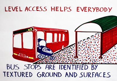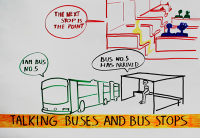 Utopian Vision Site-specific installation, Milton Keynes, 2007 How would public transport be different if it was designed by people with disabilities? This project imagines a utopia of public transport in the not-too-distant future, where everyone benefits. I worked with a group of visually-impaired people, to explore their sensitivity to the problems with the current public transport system. Participants used sound recording equipment as a research tool. Together with creativity, they have designed new models for public transport that benefit everyone. A site-specific audio installation was created for the Midsummer Place shopping centre in Milton Keynes.